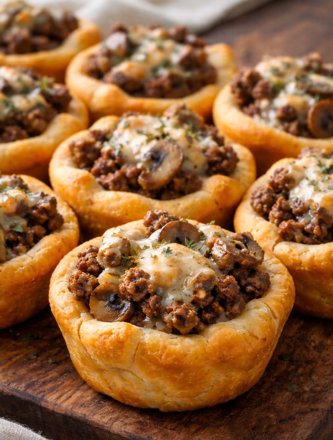 These little crescent cups are often served as an appetizer, snack, or even a light dinner. They’re especially popular because they combine the richness of seasoned beef with the earthy flavor of mushrooms, all wrapped in soft, buttery pastry that bakes up golden and slightly crisp.