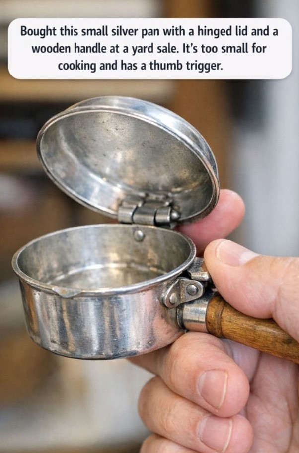 Finding unusual items at yard sales or flea markets can be exciting—but also confusing. Sometimes you come across objects that look familiar at first glance, yet something feels off. A small silver pan with a hinged lid and a wooden handle might seem like cookware, but if it’s too small to cook with and has a strange thumb mechanism, it raises questions.
