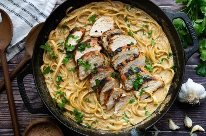 Slice the cooked chicken and place it on top of the pasta. Garnish with fresh parsley and serve immediately.