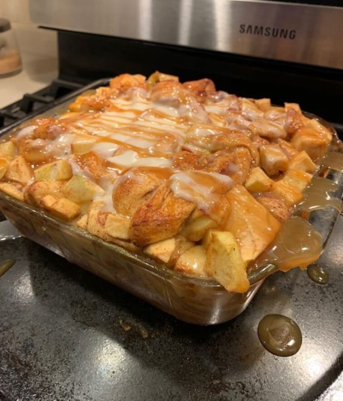 The layers of soft cinnamon rolls, tender spiced apples, and gooey caramel create a rich and indulgent bite that’s sure to delight every member of the family. Easy to make, visually impressive, and irresistibly delicious, this recipe is perfect for any occasion—whether it’s a cozy weekend morning, a holiday gathering, or simply a sweet way to brighten your day.