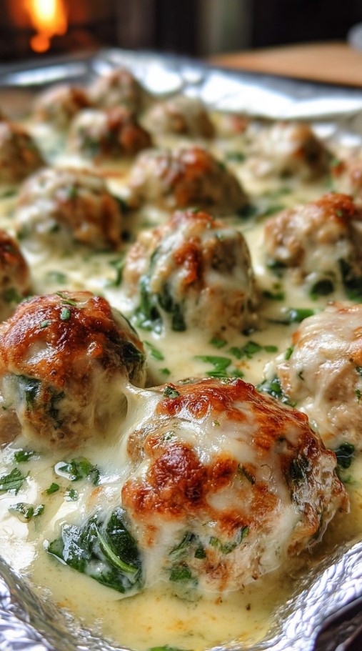 By combining lean ground chicken with creamy ricotta cheese, these meatballs turn out incredibly soft, juicy, and flavorful. Paired with a velvety Alfredo sauce infused with spinach, the result is a dish that feels indulgent yet balanced.
