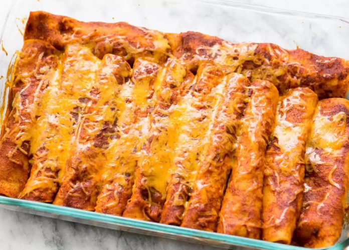 Spread a thin layer of enchilada sauce across the bottom of the prepared baking dish. This keeps the enchiladas from sticking and adds extra flavor.