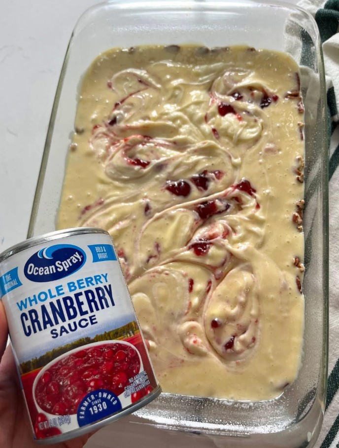 Drop spoonfuls of the cream cheese mixture over the cake batter. Then add spoonfuls of cranberry sauce across the surface.