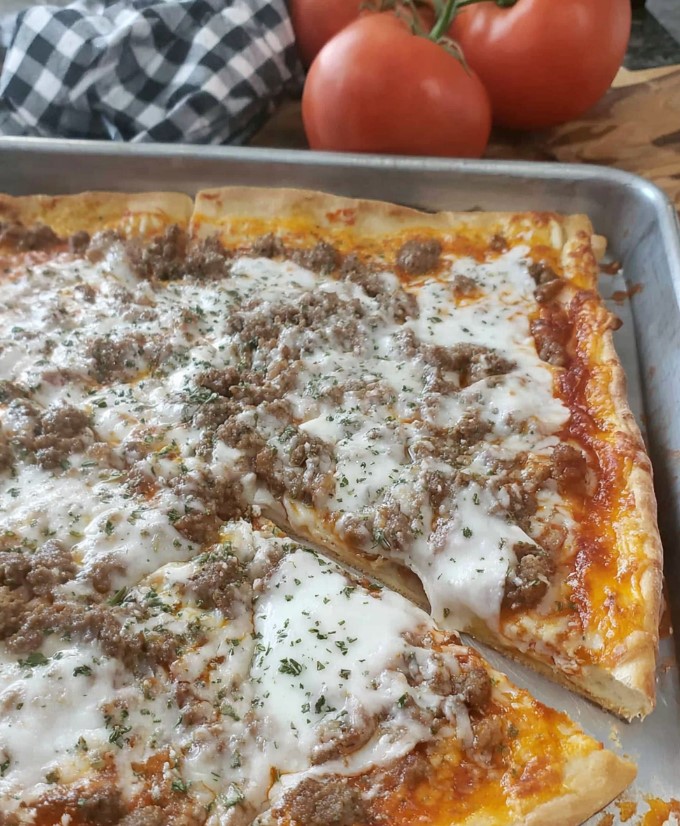 This combination of meats adds a rich, savory flavor that’s typical of classic school pizza.
