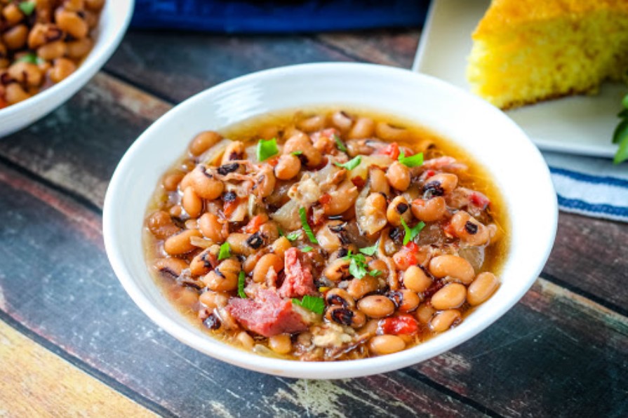 Dried black‑eyed peas simmer for hours with broth, onion, tomatoes, and a ham bone or chunks of ham, resulting in creamy peas and a flavorful broth that’s perfect spooned over rice or served with cornbread. The long, slow cooking time allows the flavors to develop beautifully with minimal effort.