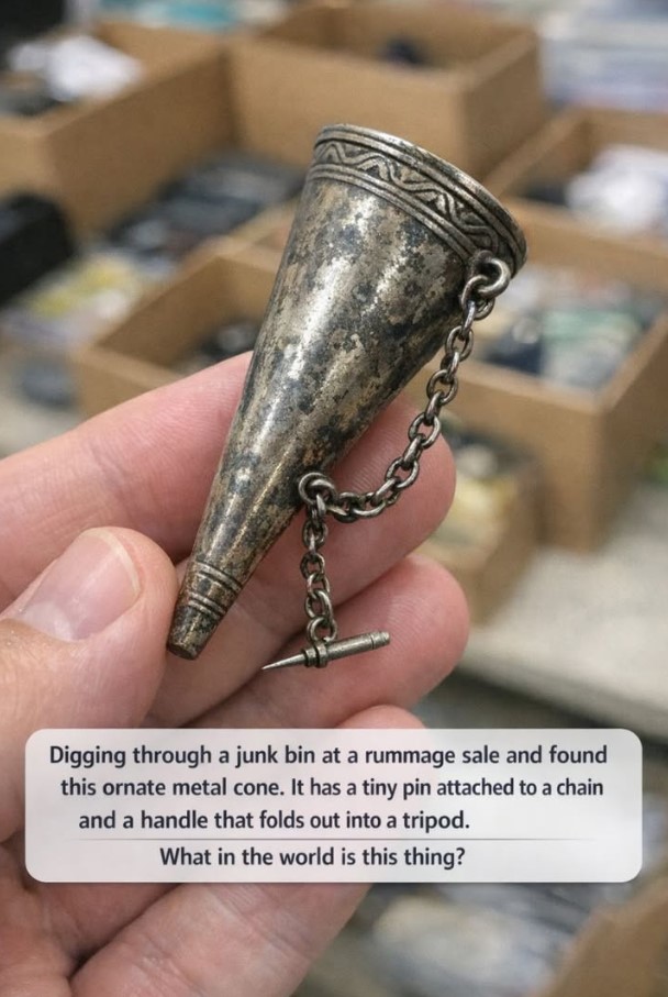 That ornate metal cone-shaped object with a chain and folding handle is almost certainly not random junk—it’s likely a vintage multifunction tool, possibly a marlinspike-style implement or Victorian sewing/dressing aid.