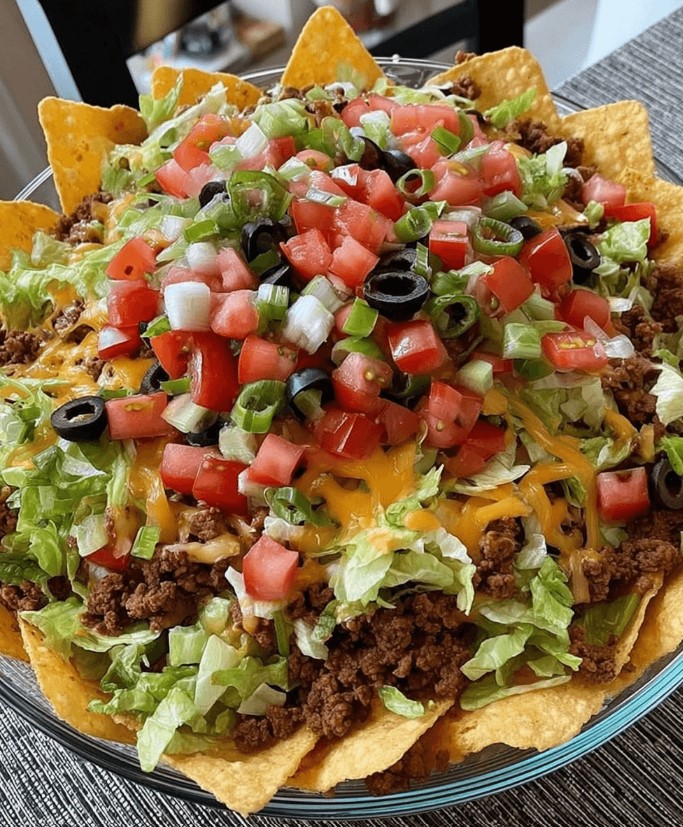 This combination of seasoned beef, fresh vegetables, cheese, and crunchy chips is what gives the dish its signature flavor and texture.