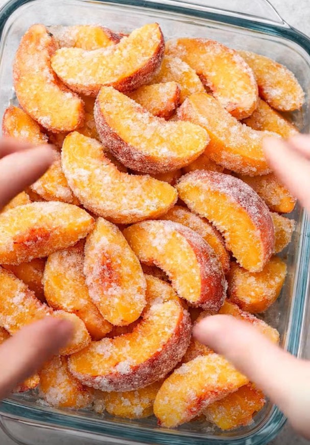 Pour the frozen peach slices directly into the dish. There’s no need to thaw them—this is what makes the recipe so easy.