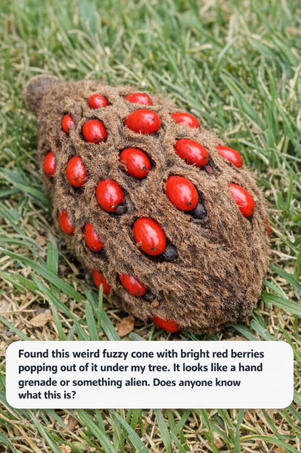 What first appears mystery‑like — a fuzzy, cone‑shaped object with bright red berries — often has a straightforward explanation rooted in plant reproductive biology. Many trees and shrubs produce seed structures that may look unusual to the casual observer but serve important purposes in nature, such as attracting birds and dispersing seeds.