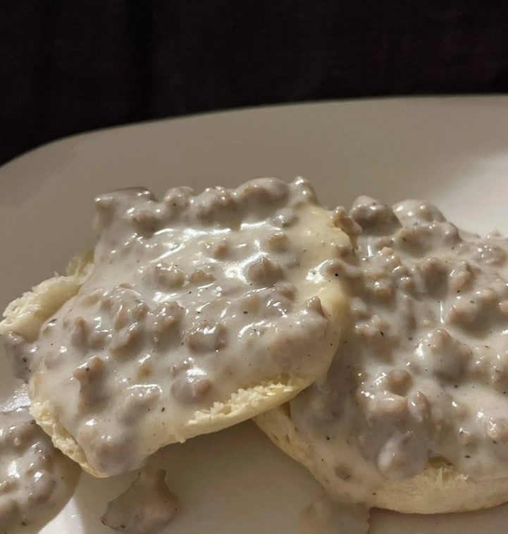Warm gravy gently on the stove or in the microwave, stirring occasionally. Add a splash of milk if it has thickened too much. Biscuits can be reheated in the oven or toaster oven to bring back crisp edges.