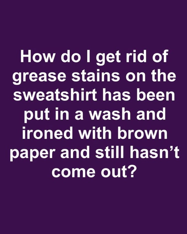Grease and oil are hydrophobic — meaning they repel water. That’s the opposite of how most laundry detergents work, which use water to lift and wash away dirt. When you wash an item that has a grease stain, water alone isn’t enough to break down the oil. Sometimes washing and especially ironing with brown paper can actually set the stain deeper into the fibers rather than remove it.