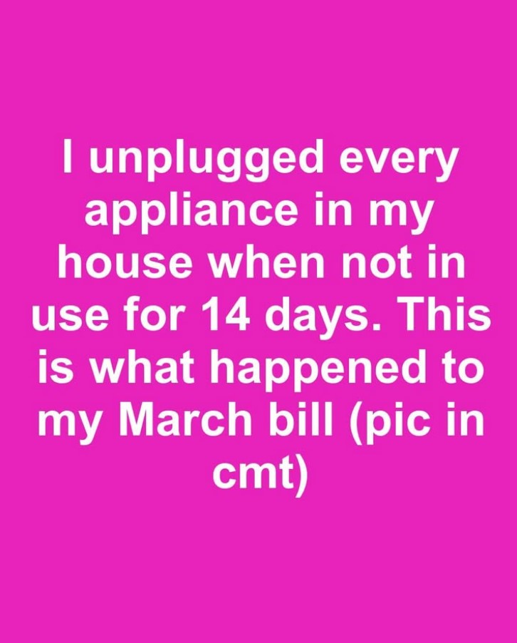 I unplugged every appliance in my house when not in use for 14 days. This is what happened to my March bill