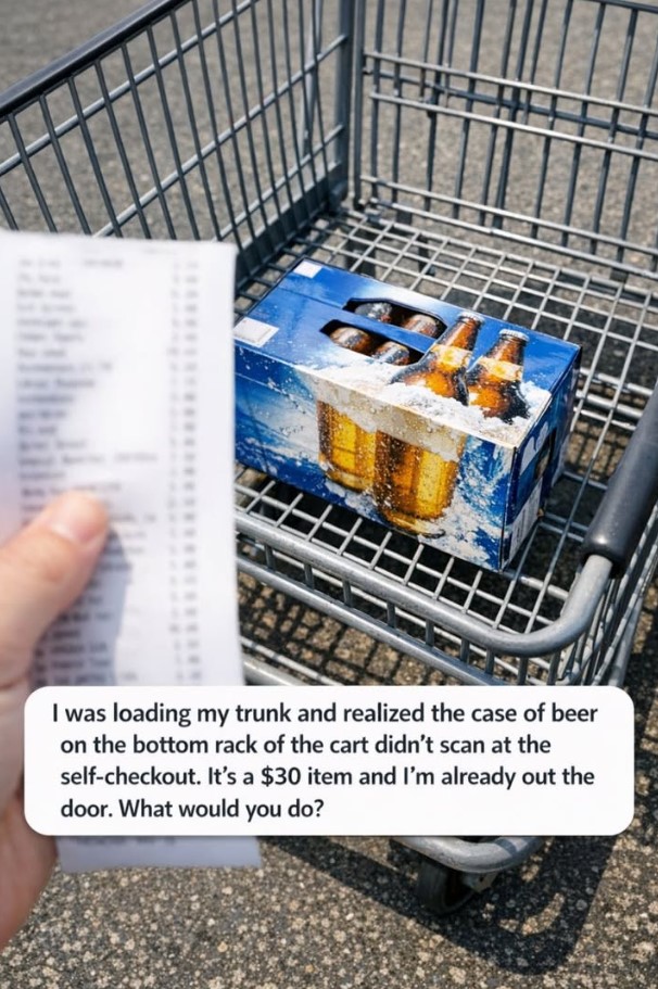 In this case, it’s a case of beer—something that was placed on the bottom rack of the cart and completely overlooked during checkout. It’s already too late. You’ve paid, you’ve left the store, and now you’re standing outside with a decision to make.