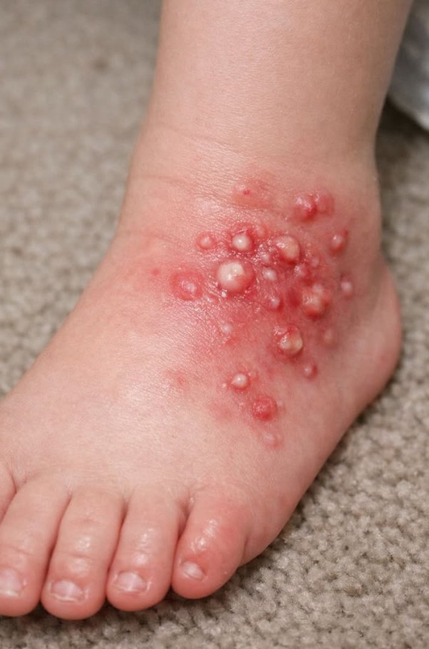 Some insect bites can trigger localized swelling and blister-like reactions, especially in children with sensitive skin. These reactions may appear within minutes or hours after exposure.