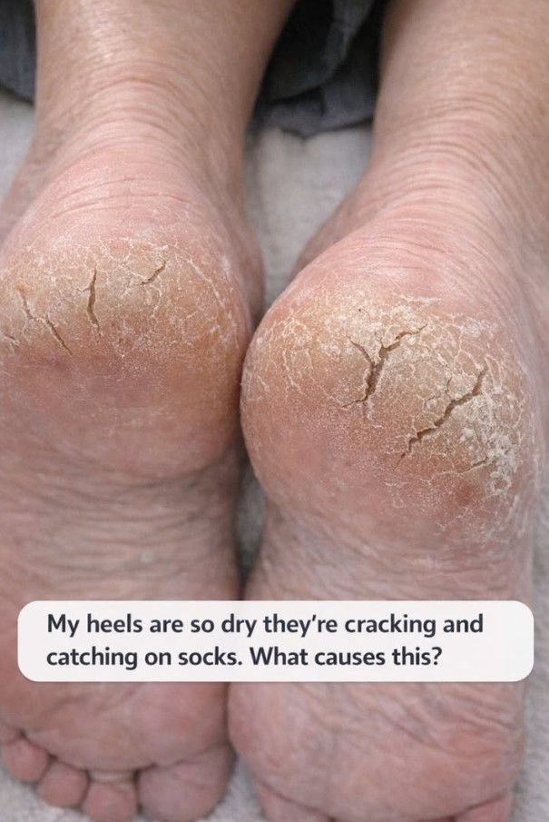 My heels are so dry they’re cracking and catching on socks. What causes this?
