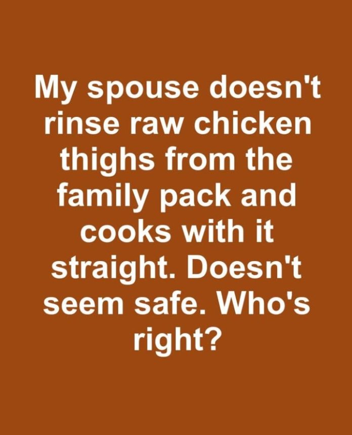 My spouse doesn’t rinse raw chicken thighs from the family pack and cooks with it straight. Doesn’t seem safe. Who’s right?