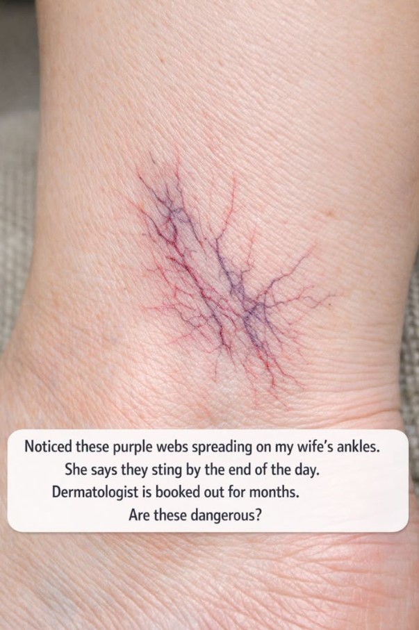 Noticed these purple webs spreading on my wife’s ankles. She says they sting by the end of the day. Dermatologist is booked out for months. Are these dangerous?