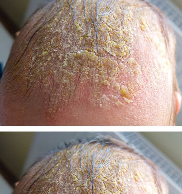 • What it looks like: Yellowish, greasy-looking scales or crusts.
