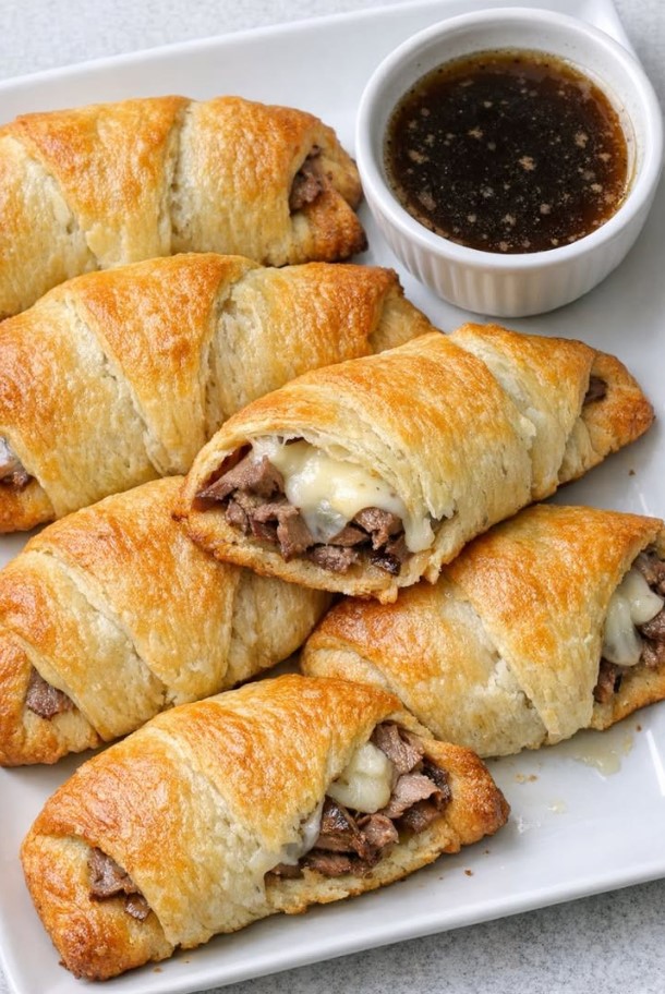 Inspired by the traditional French dip sandwich, this recipe transforms those rich, beefy flavors into perfectly portioned, golden crescent pockets. Instead of using sandwich rolls, buttery crescent dough wraps around tender roast beef and melted cheese, creating a handheld version that’s both convenient and delicious.