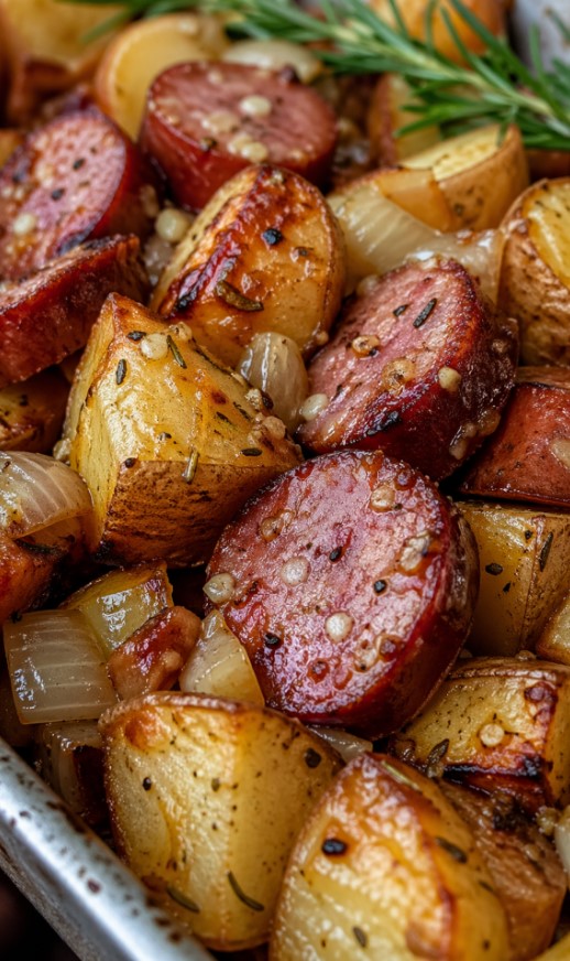 This recipe combines smoky sausage, tender roasted potatoes, sweet onions, and simple seasonings to create a one-pan dinner that is both practical and delicious. As everything roasts together in the oven, the flavors blend beautifully, creating crispy edges, juicy sausage, and perfectly seasoned potatoes in every bite.