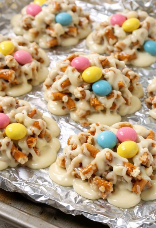The result is a batch of sweet and salty candy bites that are perfect for Easter baskets, dessert tables, or homemade gifts. Each cluster has a wonderful mix of textures—the smoothness of melted chocolate, the crunch of peanuts, and the playful sweetness of colorful candies. Many versions of this treat also include mini marshmallows or sprinkles to give the candy extra texture and a cheerful spring appearance.