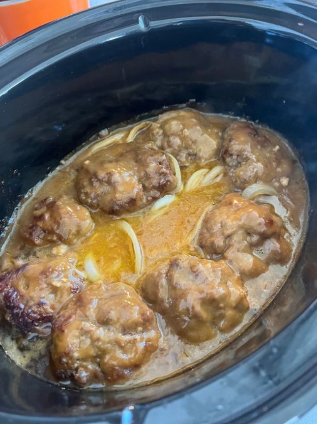 Start by lightly greasing the inside of your slow cooker so the patties don’t stick as they cook. In a large mixing bowl, combine the ground beef with breadcrumbs, milk, dry onion soup mix, dried thyme, and a pinch of salt and pepper. Mix gently with your hands until just combined — over-mixing can make the patties dense instead of tender.