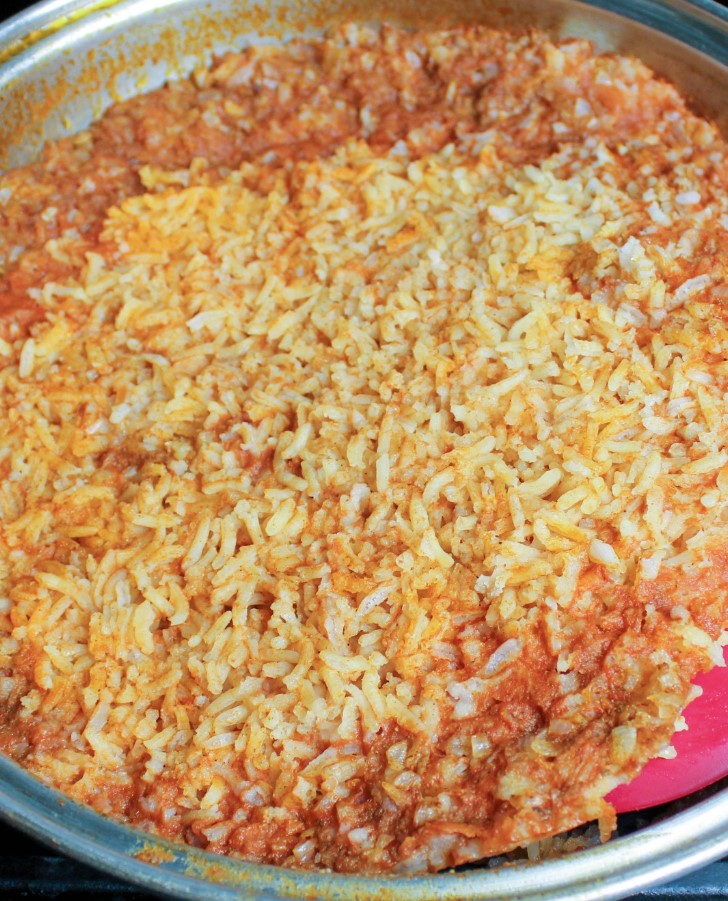 Pour in the tomato sauce and stir well. The rice should sizzle as the tomato sauce warms, helping the flavors meld immediately with the rice.