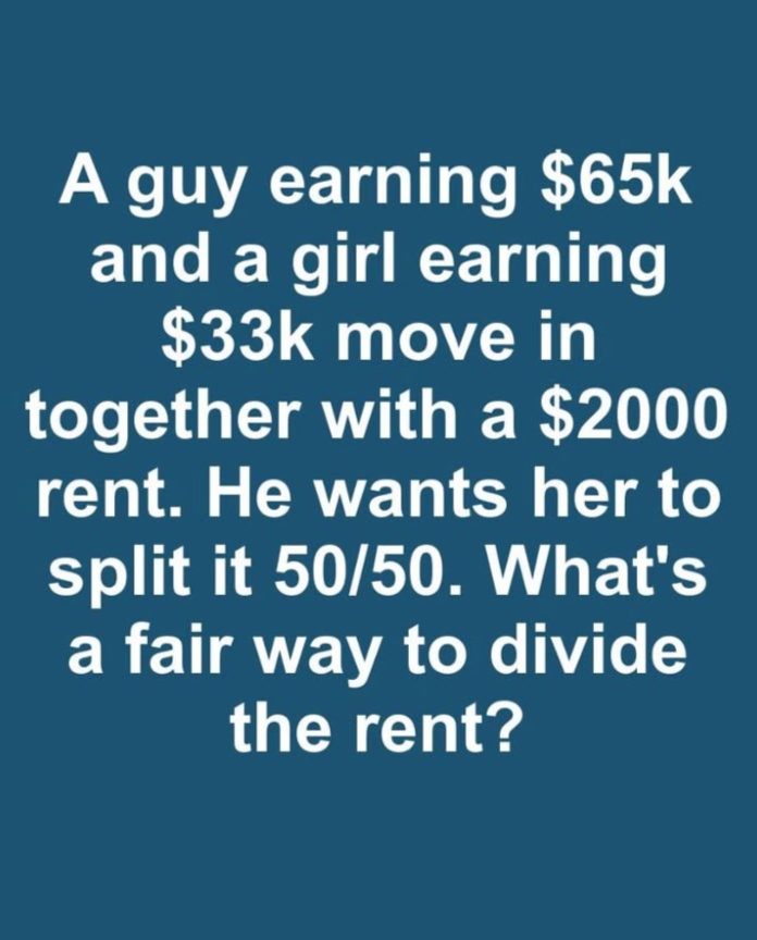 This situation comes up often. For example, imagine one person earns $65,000 per year and the other earns $33,000, and they are planning to share a rental with $2,000 in monthly rent. If they simply split the rent 50/50, the lower-earning person ends up spending a much larger share of their income on housing than the higher-earning person. That can lead to resentment, financial strain, or a sense of imbalance in the relationship.