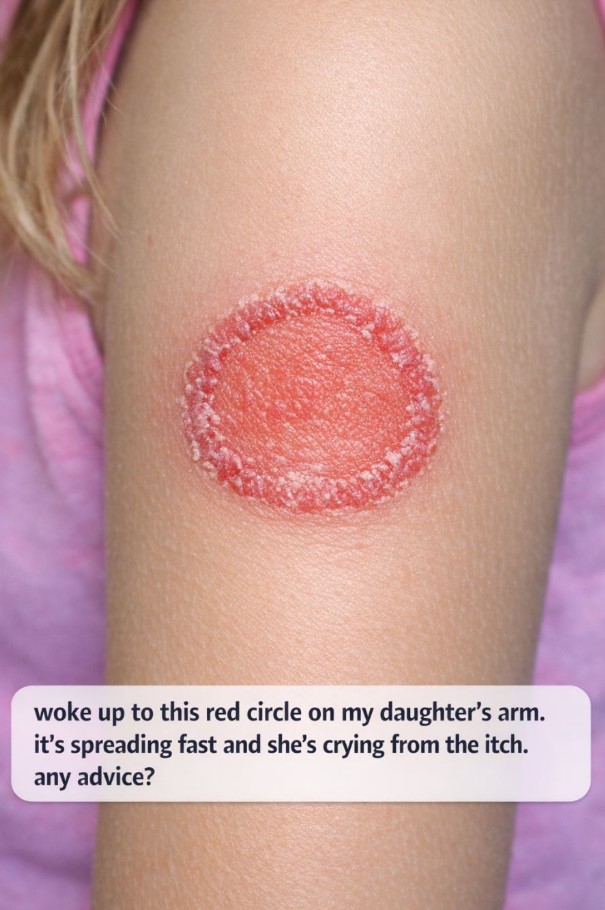 woke up to this red circle on my daughter’s arm. it’s spreading fast and she’s crying from the itch. any advice?